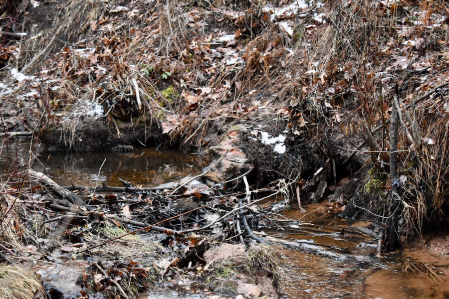 Bricks are visible next to the stream.