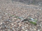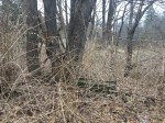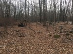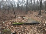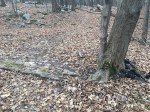 On the north end of the cul-de-sac, a concrete foundation is still visible beneath a thicket (making photos difficult). On the other side, a slight stone wall from the barn foundation sticks out of the leaves. In the woods beyond are a handful of concrete slabs from some other small, old buildings.