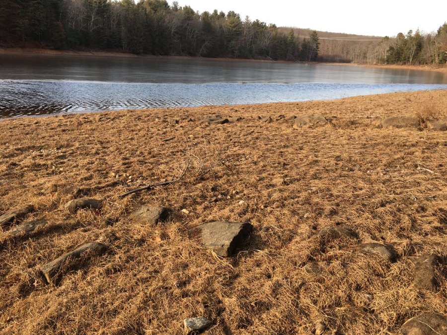 The rocks lining the old road with the reservoir water level down.
